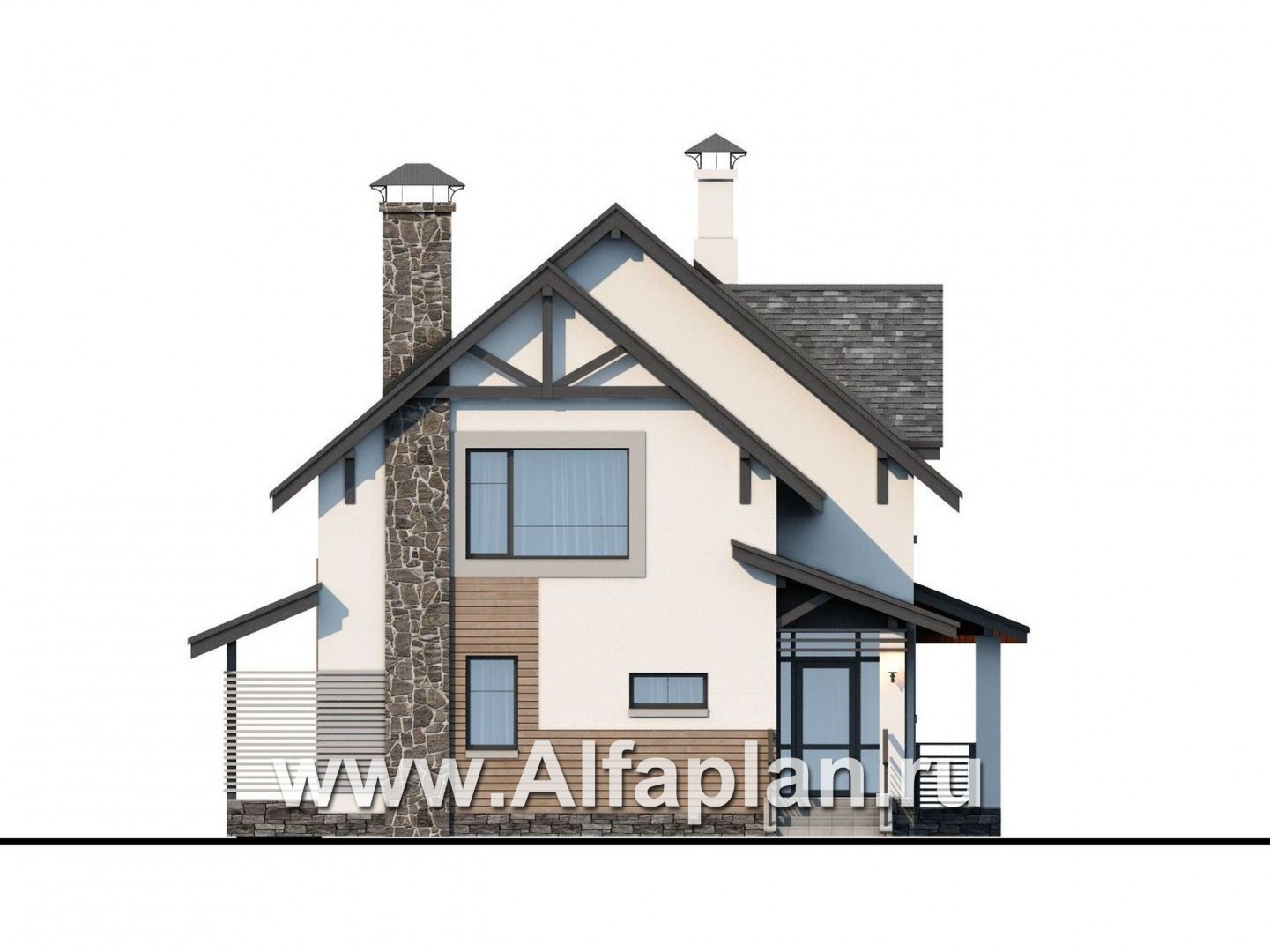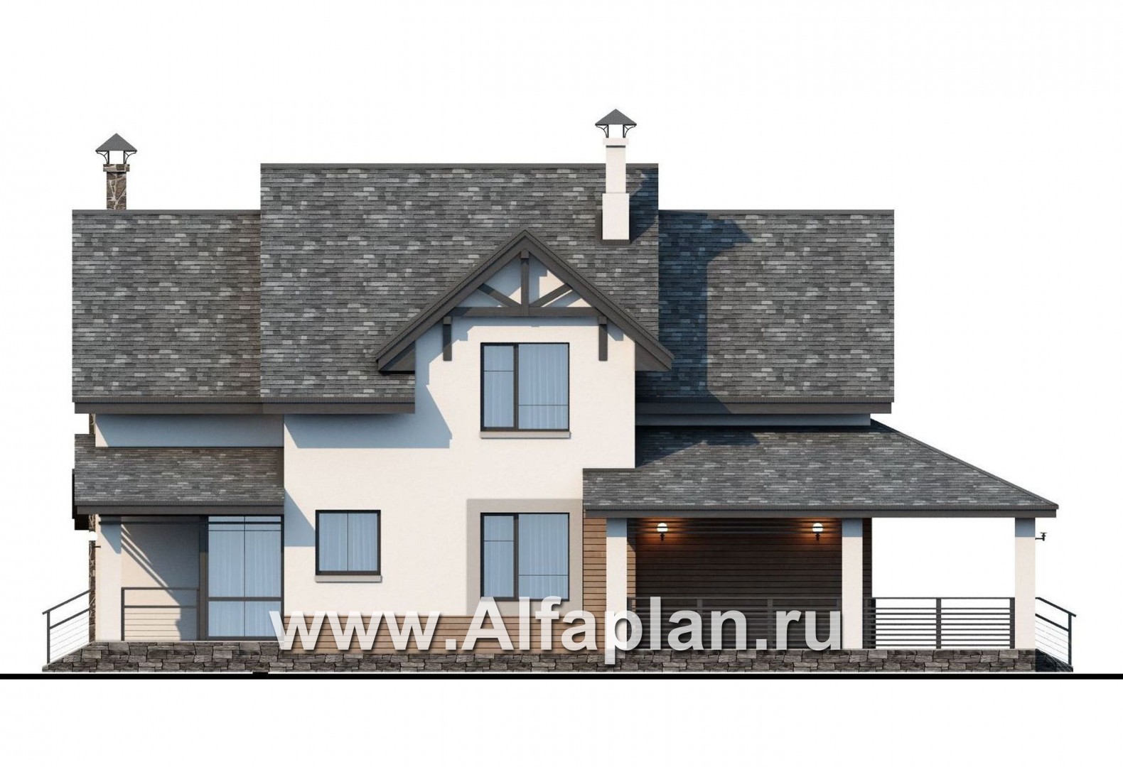 Проект коттеджа «Роза ветров» – образчик современного подхода к архитектуре. С одной стороны – четкие параллели со средневековыми традициями. Светлые оштукатуренные поверхности в сочетании с контрастными внешними сваями, подчеркивающими геометрию кровли, напоминают о знаменитых фахверковых конструкциях. Декоративные элементы, выполненные из крупного рустового камня, также ассоциируются с монументализмом, весомостью средневековой архитектуры. С другой стороны – устремленность вверх, легкость, подчеркнутая декоративными элементами из дерева. И, конечно, восхитительная небрежность асимметрии, причем касается это как особенностей дизайна фасада, так и тонкостей расположения архитектурных элементов.
