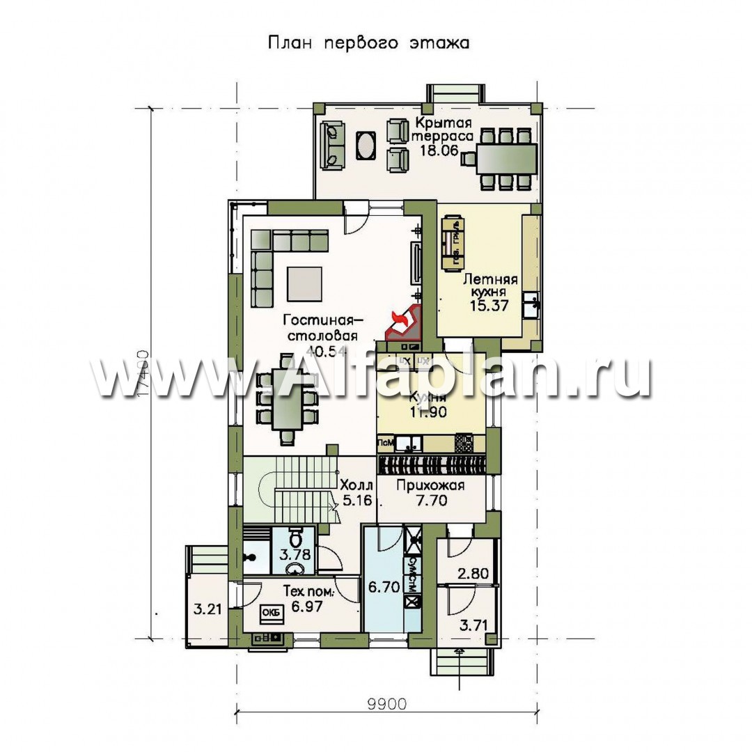 Согласно проекту кирпичного (газобетонного) дома, гостевая зона, занимающая основное пространство первого этажа, смещена к дворовому фасаду. Это Г-образная гостиная-столовая со вторым светом, оборудованная угловым камином, а также примыкающая к ней кухня. Эти два помещения могут быть объединены в студию. В теплое время года процесс приготовления пищи переносится на пристроенную летнюю кухню, а место для трапез – соответственно на крытую террасу, оборудованную отдельным выходом во двор.