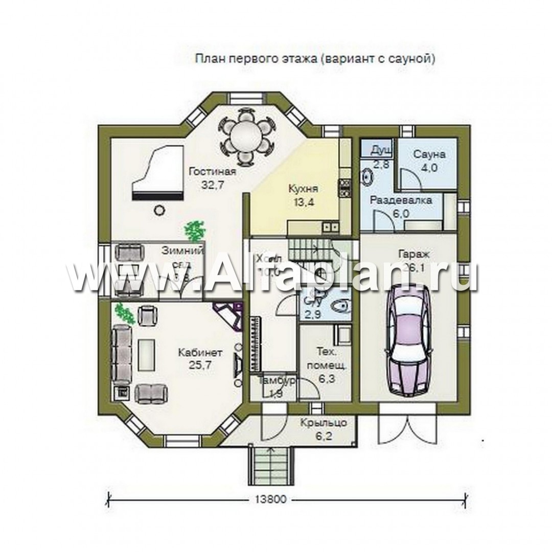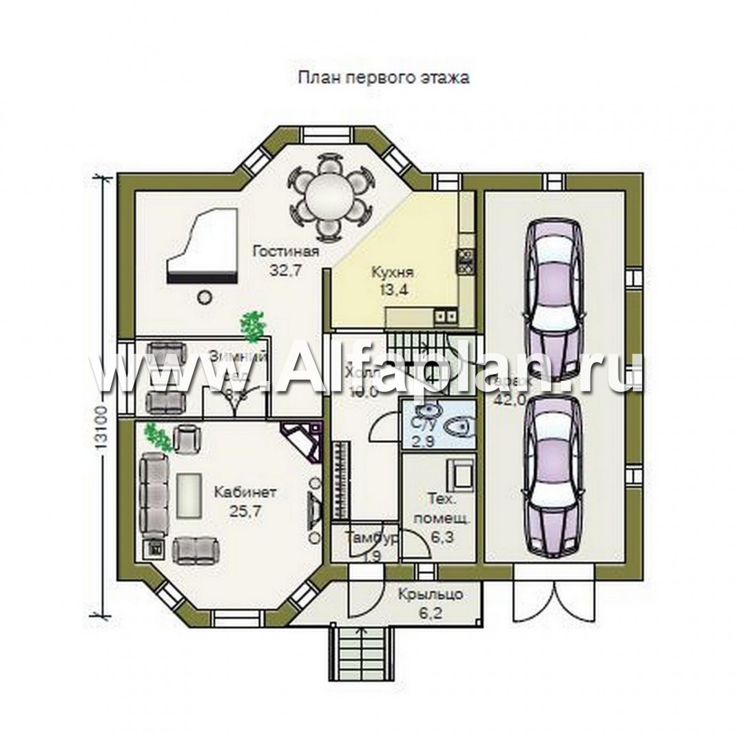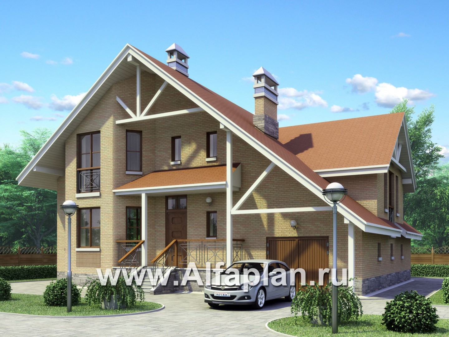 Удобныйи просторный коттедж с двускатной кровлей предназначен для постоянного проживания многочисленной семьи. Дом двухэтажный с гаражом на два автомобиля. Характер фасадов дома формируется двумя мощными шестигранными эркерами. На первом этаже перегородками выделена входная зона, включающая в себя прихожую, лестницу, техническое помещение и санузел. Гостиная, столовая и кухня представляют собой перетекающее, открытое пространство. В отдельное помещение выделен кабинет с камином. При необходимости его можно объединить с гостиной.На втором этаже расположена спальная зона. Гараж на две машины запроектирован теплым, разработан вариант с гаражем на одну машину и банным комплексом с сауной, душевой и комнатой отдыха. Над гаражом запроектирована жилая комната, которую можно использовать как гостевую или под бильярд.
